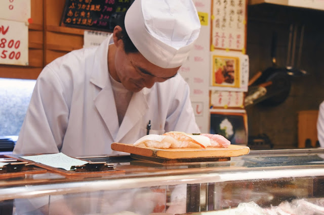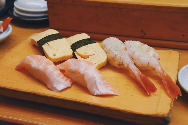 枕邊人稍微懂一點日語,邊教我一些簡單的問候語,我邊吃邊笨拙地跟著唸,師傅聽見我用生硬的外地口音唸他們的母語,被逗得樂呵呵,捏壽司的時候笑個不停。